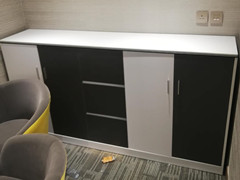 顏色:臺面以上為白色1002+條玻,臺面以下為光 面黑布紋8182,臺面板為白色1002,柜子2側面為光面黑布紋8182,其他為白色1002