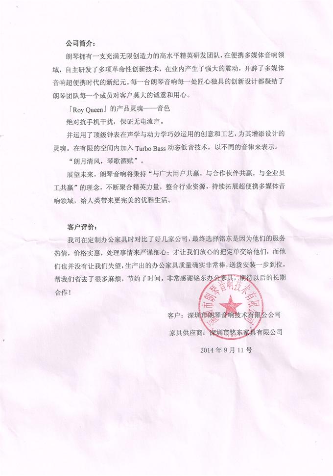 我司在定制辦公家具時對比了好幾家公司,最終選擇銘東是因?yàn)樗麄兊姆?wù)熱情,價格實(shí)惠,處理事情來嚴(yán)謹(jǐn)細(xì)心;才讓我們放心的把定單交給他們,而他們也并沒有讓我們失望,生產(chǎn)出的辦公家具質(zhì)量確實(shí)非常棒,送貨安裝一步到位,幫我們省去了很多麻煩,節(jié)約了時間。非常感謝銘東辦公家具,期待以后的長期合作!