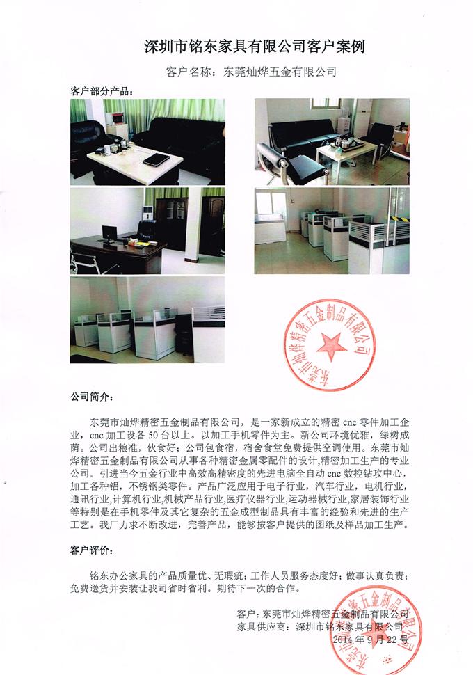 東莞燦燁五金:鑫銘東辦公家具的產品質量優(yōu)、無瑕疵;工作人員服務態(tài)度好;做事認真負責;免費送貨并安裝讓我司省時省利。期待下一次的合作。